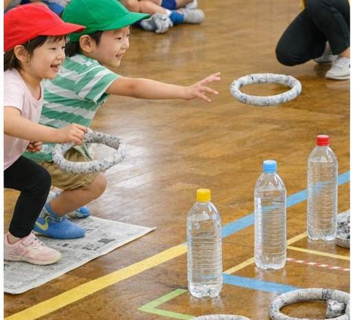 ビニール袋の口に、新聞紙を棒状にして丸めた物を(輪投げ)くっつけるとバスケットゴール風の玉の入れが簡単に作れます。